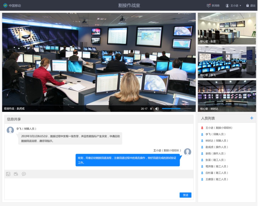 通过调用协同作战室,可在各个应用场景中建立各场景下的联合作战,可通过图文即时通信、音视频实时通信了解各作战地点情况、与各支撑单位会商、下达作战命令,实现对作战全过程的实时、可视、互动式指挥。同时在作战室中还可以有针对性地查看告警、投诉、性能、进展、人员分布等实时信息。